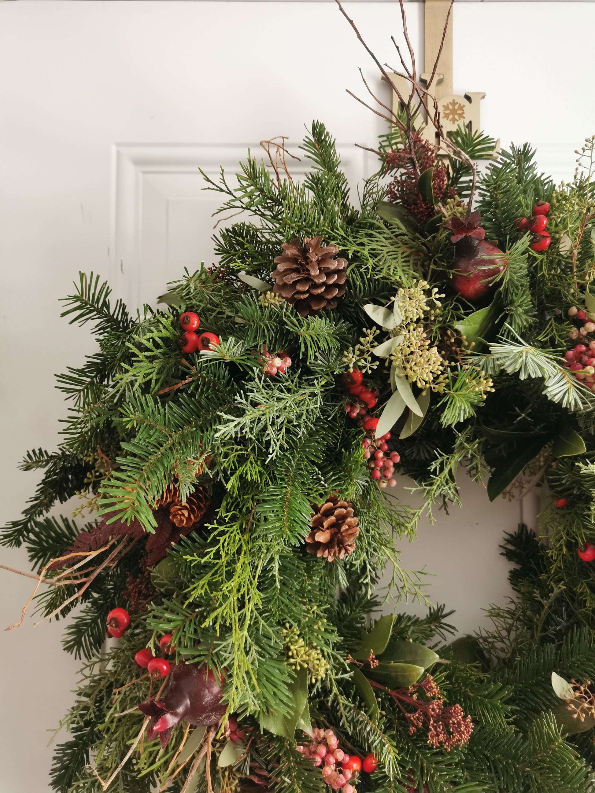 natural | the focus of this wreath becomes the greenery itself with the addition of natural elements such as pine cones, dried limes, natural toned branches and other dried materials