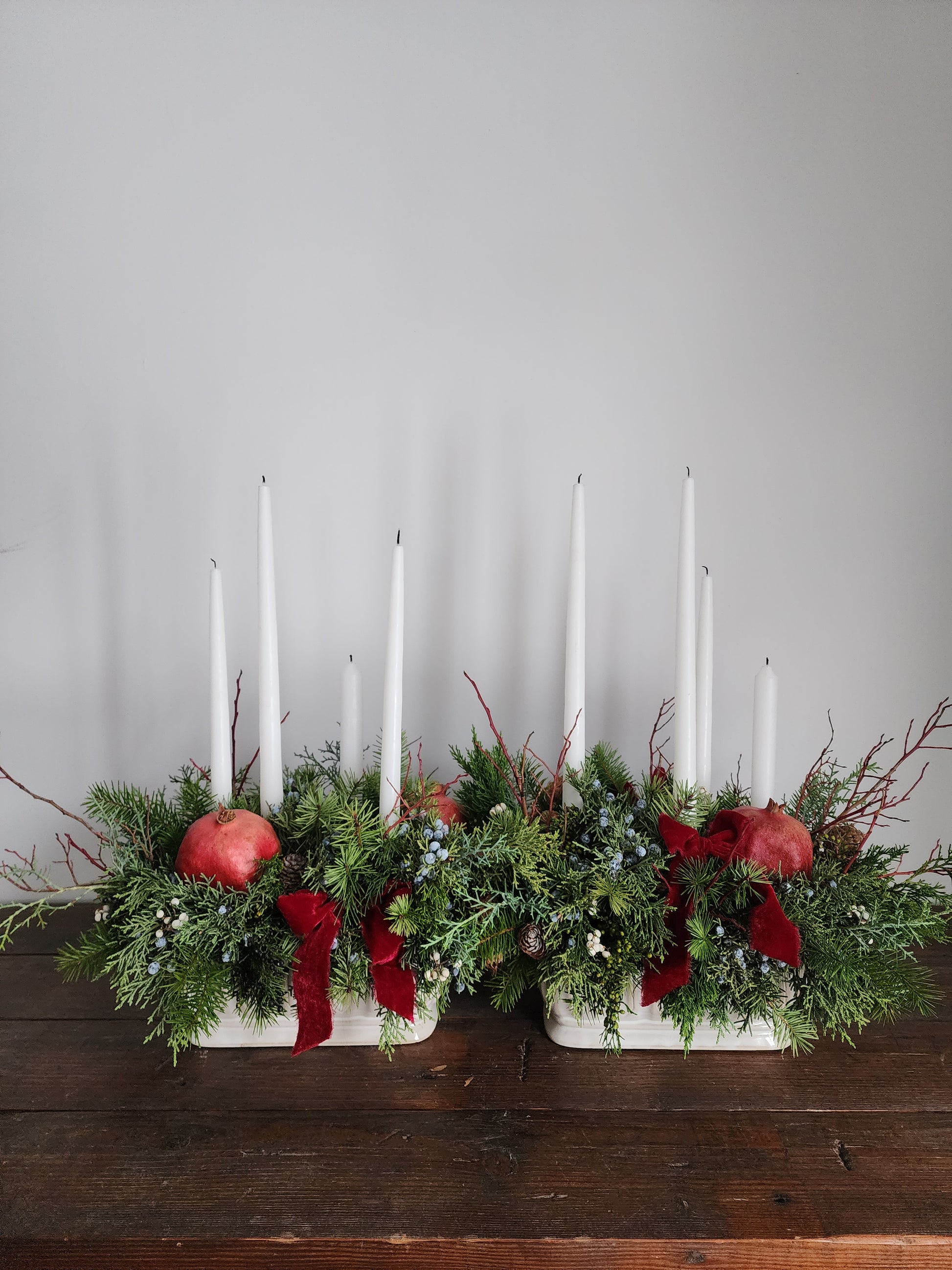 A simple and classic centerpiece arrangement perfect for the holidays! Created in a low, elongated vessel this centerpiece will look stunning along the center of a beautiful holiday table. The blend of winter greens, pomegranates, ribbons and natural elements, when kept properly hydrated, will last for several weeks.